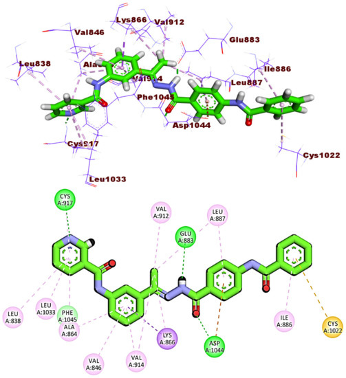 The best docking pose of compound 10 was nominated as the most probable binding conformation. The docked compound showed promising binding patterns in the VEGFR-2 binding site, interacting with the key amino acids. The pyridine ring is accommodated in the hinge region, achieving hydrogen bonding interaction with Cys917 besides three 2 π interactions with Leu838, Leu1033, and Ala864. The 1-phenylethan-1-imine moiety represented a linker moiety that occupied the linker region to form eight hydrophobic interactions with Ala864, Val846, Val912, Lys866, Leu887, and Val914. As well, the amide moiety of the hydrazone arm formed a hydrogen bond with the carboxylate moiety of Glu883 (1.84 Å) and another hydrogen bond with the NH of Asp1044 (2.11 Å) in the DFG region. The terminal N-phenylbenzamide interacts with the hydrophobic side chains of the amino acids (Leu887 and Ile886) lining the allosteric pocket (Figure 5).