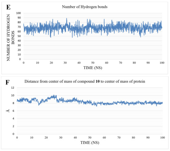 MD analysis. (A) RMSD. (B) RMSF. (C) SASA. (D) RoG. (E) H-bonding. (F) Change in the distance from the center of mass of the compound 10-VEGFR-2 complex.