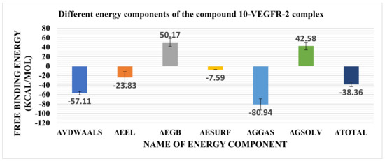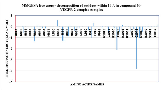 To measure the strength of binding, the gmx_MMPBSA library was utilized. Figure 7 shows the values of energy components of the MMGBSA and their standard deviations. The binding in the compound 10-VEGFR-2 complex is mostly due to the Van Der Waals interaction (average of −57.11 Kcal/Mol) followed by the electrostatic interactions (average of −23.83 Kcal/Mol) and total binding energy of −38.36 Kcal/Mol. Amino acid contribution to the binding was measured by the decomposition of the MMGBSA to know which amino acids are contributing most to the interaction (Figure 8). Nine amino acids show a contribution to the binding, with values less than −1 Kcal/Mol. V846, I886, L887, V914, C1022, I1023, C1043, D1044, and F1045 show binding contributions of −1.32 Kcal/Mol, −1.27 Kcal/Mol, −1.31 Kcal/Mol, −1.03 Kcal/Mol, −2.09 Kcal/Mol, −2.11 Kcal/Mol, −3.81 Kcal/Mol, −1.87 Kcal/Mol, and −1.04 Kcal/Mol, respectively.