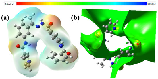 Total electron density, TED; (a) and electrostatic potential, ESP; (b) maps of compound 10 at the 6-311G++(d,p) basis set.