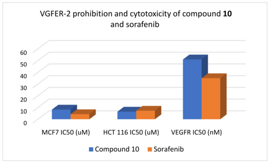 To assess the applicability of compound 10’s ability to inhibit VEGFR-2, in-vitro cytotoxicity tests were performed using MCF-7 and HCT 116 as cancer models. Sorafenib was used as the reference drug.