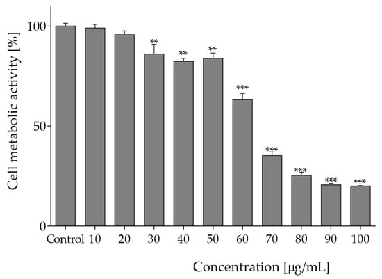 The influence of O. pseudoglandulosa extract on Caco-2 cells metabolic activity determined with PrestoBlue assay upon 24 h of incubation. Control cells were only exposed to the vehicle. Values were shown with mean standard deviations, n ≥ 9. Statistical significance was calculated against control cell culture (untreated) with ** p ≤ 0.005, *** p ≤ 0.001.