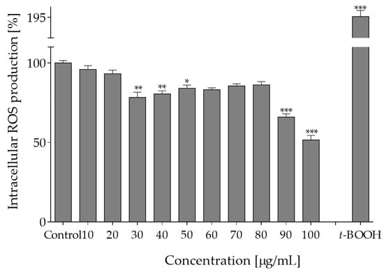 Intracellular reactive oxygen species are involved in cellular signaling, but their excessive accumulation leads to oxidative stress and results in damage to proteins and lipids. Therefore, in the next step, the influence of plant extracts on intracellular level of ROS in Caco-2 cells was determined with fluorogenic DCFH-DA probe. As shown in Figure 2, pre-incubation of cells with extracts at 0–40 µg/mL decreased intracellular ROS level by 5–25%. It is known that this type of biological activity plays a crucial role in protection against oxidation of cellular lipids, proteins and DNA. Since epithelial cells are constantly exposed to luminal oxidants from ingested foods, the observed reduction of oxidative stress indicates cytoprotective effect of O. pseudoglandulosa. Consequently, as a next step of research, the chemopreventive potential of the medicinal plant extract was tested against chronic oxidative stress induced by t-BOOH.