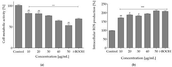 The reagent t-BOOH generates oxidative stress under in vitro conditions through formation of tert-butoxyl, peroxyl, alkoxyl and methyl radicals that catalyze lipid peroxidation, DNA strand breakage and disturbance in intracellular calcium homeostasis. As compared to the control cell culture (0% plant extract sample), t-BOOH caused over a 2-fold elevated level of intracellular oxidative stress. However, when cells were pre-incubated with the extract concentrations 10–40 µg/mL prior to t-BOOH treatment, the adverse level of oxidative stress was diminished by nearly 30%. The most pronounced protective effect against oxidative damage induced by t-BOOH was observed for 10 µg/mL concentration (Figure 3a). The exposure to t-BOOH also influenced the metabolic activity of Caco-2 cells and lowered it to almost 75%. When cells were pre-incubated with the plant extract at concentrations 10–30 µg/mL, the cytotoxic effect of t-BOOH on metabolic activity was attenuated by nearly 10% (Figure 3b).