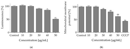 Given the fact that mitochondria are a driving force behind cellular ATP synthesis, the influence of extract on mitochondrial membrane potential (MMP) was tested with JC-1 probe, a cationic carbocyanine dye that accumulates in mitochondria. As shown in Figure 4b, O. pseudoglandulosa extract reduced mitochondrial membrane potential in a concentration-dependent manner. The highest efficiency was revealed at 50 µg/mL concentration with the MMP value being declined to almost 60%.