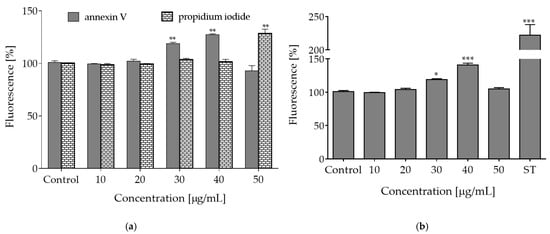 Metabolic activity is closely related to mitochondria activity and ATP level. Therefore, due to the reported depletion of ATP, decrease of MMP and increase of ROS, we aimed to examine the type of cellular death induced by elevated concentrations of the extract. To this end, the fluorescent conjugates of Annexin V were applied, which are able to bind to the externalized phosphatidylserine (PS) in the cell membrane. Translocation of PS to outer leaflet of the cell membrane is characteristic for apoptotic cells. Simultaneously, propidium iodide (PI) was used, which is able to stain nuclei of necrotic cells with permeabilized membranes. As shown in Figure 5a, the highest number of apoptotic cells positive for Annexin V staining was observed after the cells were treated with 30–40 µg/mL of O. pseudoglandulosa extract (about 15–25% increase). After incubation with 50 µg/mL of the extract, a prominent level of cells positive for propidium iodide staining was detected—in this case, nearly 25% more cells exhibited high extent of red fluorescence specific for necrotic nuclei.