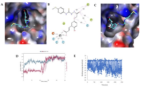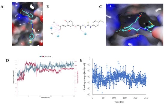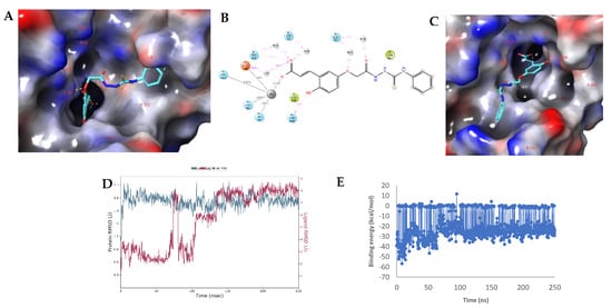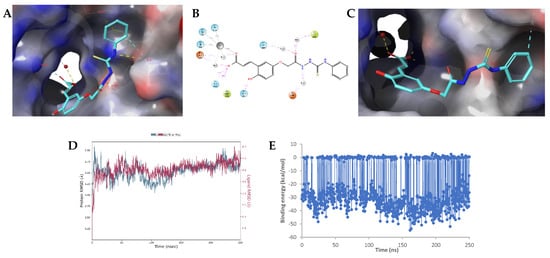(A) The docked pose 14a-(E)-open. (B) Ligand–protein binding interactions observed for 30% or more of the duration of the unrestricted MD simulation. (C) Ligand pose after a 250 MD simulation. (D) RMSD value of the protein Cα-atoms and the ligand heavy atoms. (E) MM-GBSA binding energy. In the 2D plots, anionic residues are indicated in red, cationic residues are indicated in purple, hydrophobic residues and surfaces are indicated in green and hydrophilic residues and surfaces are indicated in light blue. Hydrogen bonds are indicated in purple (2D plots) or yellow (A,C) dashed lines.