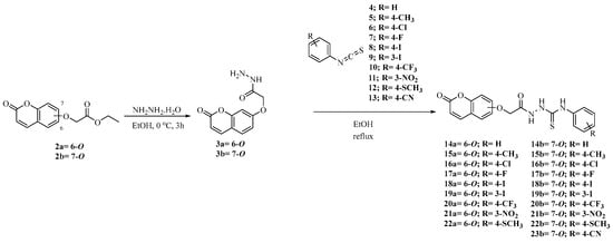 Intermediates 2a,b and 3a,b were prepared according to previously reported experimental procedures [6,7] which were subjected to addition reactions on freshly prepared aryl isothiocyanates 4–13 [11] to afford the final 6- and 7-substituted coumarins 14a,b–22a,b and 23b. All final compounds were purified by silica gel column chromatography or crystallization from the appropriate solvents and were fully characterized by means of 1H-NMR, 13C-NMR and mass spectra.
