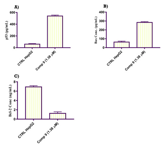 2.2.6. In Vitro ELISA Quantification of the Level of p53, Bax and Bcl-2
