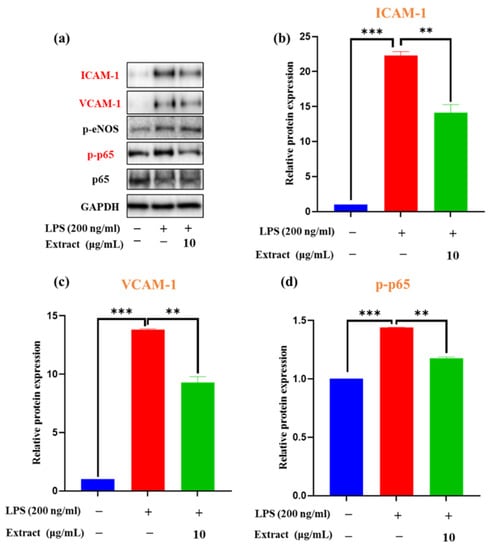 HUVECs were pretreated with vehicle, or A. quinata leaves extracts (10 μg/mL) and followed by treatment with 200 ng/mL of LPS. Afterward, cells were washed with PBS, and lysates were prepared using 2× SDS lysis buffer including 1 M Tris-HCl (pH 7.4), 10% SDS, 25% glycerol, 5% 2-mercaptoethanol, and 1% bromphenol blue [24]. The protein extracts were resolved by using sodium dodecyl sulfate-polyacrylamide gel electrophoresis. Following blocking with 5% skimmed milk for 1 h at ambient temperature, the membranes were incubated with primary antibodies (1:1000 dilution) at 4 °C for 12 h, and subsequently incubated with secondary antibodies (1:2500 dilution) for 90 min at ambient temperature. The proteins on the membrane are eventually visualized by using the enhanced chemiluminescence detection reagents (Amersham Pharmacia Biotech, Piscataway, NJ, USA) based on the manufacturer’s instructions. The expression level of each protein was measured by western blotting with each matching unique antibody.