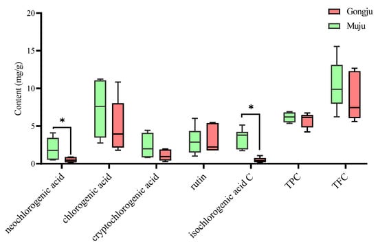 The HPLC–DAD method was subsequently used for the comprehensive quality assessment of 14 A. quinata leaves samples. The results of the quantitative determination are shown in Figure 2, which suggests that the contents of the chlorogenic acid, cryptochlorogenic acid, and rutin were not significantly different between the cities of Muju and Gongju (p > 0.05). Additionally, TFC and TPC did not show any significant differences between the two cities (p > 0.05). In contrast, there were remarkable differences in the amounts of neochlorogenic acid and isochlorogenic acid C between the two cities (p < 0.05). Interestingly, isochlorogenic acid C is considered the active compound in A. quinata stems that inhibits the differentiation of 3T3-L1 cells, thus enhancing the activation of adenosine monophosphate-activated protein kinase phosphorylation for the treatment of obesity and hyperlipemia [17]. Moreover, phenolic acids have been known to prevent pathological processes, such as diabetes, cardiovascular diseases, obesity, and atherogenic processes [44,45,46,47]. Thus, A. quinata leaves could be a potential agent in the development of functional foods that can treat obesity and cardiovascular disease. Since we have shown that the number of bioactive compounds can differ according to location, the cultivation regions should be considered to ensure the safety and validity of A. quinata leaves [34].