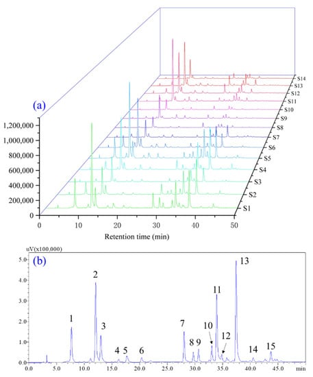 Under the optimal HPLC–DAD conditions, the typical HPLC fingerprints of the 14 samples had similar HPLC profiles (Figure 3a). Based on the fingerprints of A. quinata leaves from the different cities, the S2 chromatogram was selected as a representative chromatogram since it contains the most investigated ingredients (Figure 3b). When considering the peak responses, separation, and retention times, 15 peaks responsible for more than 90% of the total peak area were selected for further analysis. Among these, 11 peaks were assigned as neochlorogenic acid (peak 1), chlorogenic acid (peak 2), cryptochlorogenic acid (peak 3), 5-O-p-coumaroylquinic acid (peak 5), 5-O-feruloylquinic acid (peak 6), rutin (peak 7), quercetin-3-O-glucoside (peak 8), nictotiflorin (peak 10), isochlorogenic acid A (peak 11), astragalin (peak 12), and isochlorogenic acid C (peak 13) by comparing their retention time, MS spectrum (in the positive and negative modes), fragmentation ions, and UV spectrum with those of standard compounds and available references [7,48,49]. The other four peaks remained unknown.