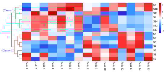 HCA is a clustering technology that analyzes the similarity and differences among different groups via an algorithm to obtain a dendrogram, which can directly show the differences between samples through color changes on a heatmap [50,51]. Thus, a heatmap cluster analysis was performed to evaluate the similarity and difference of the bioactive component profiles in the A. quinata leaves (Figure 4). The results showed that the 14 samples could be classified into two clusters: samples 8–14 from Gongju were gathered in Cluster I with the lower contents of peak 1 (neochlorogenic acid), peak 3 (cryptochlorogenic acid), and peak 13 (isochlorogenic acid C); those from Muju were distributed in Cluster II and exhibited a higher content of peak 9 (unknown), peak 12 (astragalin), and peak 13 (isochlorogenic acid C). The different contents of these bioactive components may be a result of the different growth conditions in their respective environments [52,53].