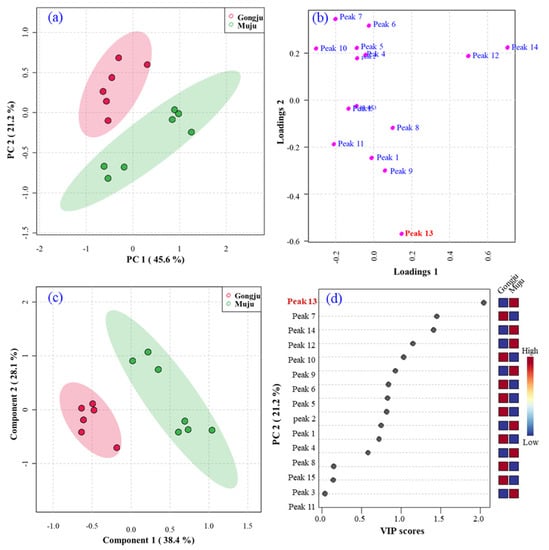 The two major principal components (PC1 and PC2), accounting for 66.8% of the total variance, were selected to produce the PCA score plot of common components in all samples. As shown in Figure 5a, the PCA score plot separated the samples into two clusters (Cluster I: Gongju; Cluster II: Muju), which was in accordance with the heatmap cluster analysis results. The loading scatter plot (Figure 5b) showed that peak 13 was located far from the y-axis, suggesting that this component could be the marker compound among the bioactive components in the A. quinata leaves. PLS-DA was performed to investigate the source of the differences between the two clusters. The R2 and Q2 values of the cross-validation were 0.99 and 0.87, which demonstrates that the PLS-DA model was stable and valid and can be used to discriminate the samples (Figure 5c) [54]. The VIP score (Figure 5d) also illustrated that peak 13 (isochlorogenic acid C) was the most contributing marker compound for the discrimination of A. quinata leaves from Gongju and Muju (VIP > 1.5).