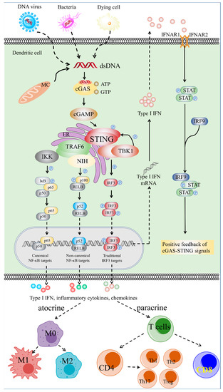 - Tao, J.; Zhou, X.; Jiang, Z. cGAS-cGAMP-STING: The three musketeers of cytosolic DNA sensing and signaling. IUBMB Life 2016, 68, 858–870. [Google Scholar]