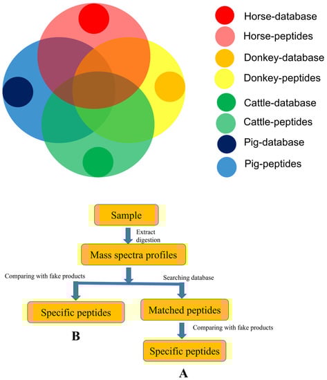 The specificity of these markers relies on the proteomics database (Figure 1A) [2,8,9,10,11,12,13,14,15], but many of the databases are shared by different species, e.g., that shared by donkey (Equus asinus) and horse (Equus caballus) [16,17,18,19]. Kumazawa et al. identified a total of 396 peptides for deer glue, including 55 peptides from bovine (Bos taurus) and 37 peptides from sheep (Ovis aries) [16]. The myoglobin peptide HPGDFGADAQGAMTK is horse-specific in the UniProt database [20]; however, it also exists in donkeys [18]. Furthermore, Prandi et al. found that all the peptides identified in horse meat were also present in donkey meat. Therefore, this myoglobin peptide has to be used as a marker peptide for equine meat (horse and donkey) in their study [18]. The specific peptide GPPGAAGPPGPR for authentication of Ejiao in the Chinese Pharmacopoeia is also found in horse-hide gelatin [2,8]. More importantly, many peptides are not recorded in these protein databases [16,18]. For example, information on pig COL1A1 is lacking [8]. The deer type I collagen sequence is not included in public databases [16]. As a result, there are no donkey-specific markers. New reliable and specific marker(s) must be found in another way (Figure 1B).
