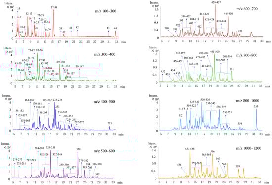 There were several steps to find authentication markers. Firstly, as shown in Figure 2, we scanned every ion in the range of m/z 100–1200 and found 569 ions in standard donkey-hide gelatin (Supplementary Table S1). Similarly, we screened every ion in standard horse gelatin, cattle gelatin, and pig gelatin, and found 575, 474, and 453 ions, respectively (Supplementary Tables S2–S4).