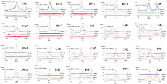 In summary, 17 specific marker ions (Table 1), namely 7 donkey-specific (DM1~DM7), 1 horse-specific (HM1), 3 cattle-specific (CM1~CM3), and 6 pig-specific marker ions (PM1~PM6), were successfully found.