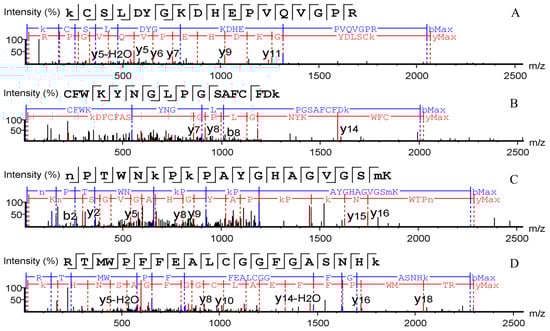 The sequence of four donkey-specific marker peptides identified by de novo sequencing (in PEAKS Studio software using a tolerance of precursor and fragment mass of 0.1 Da), including (A) DM1, KCSLDYGKDHEPVQVGPR; (B) DM2, CFWKYNGLPGSAFCFDK; (C) DM3, NPTWNKPKPAYGHAGVGSMK; (D) DM4, RTMWPFFEALCGGFGASNHK.