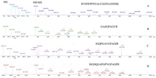 MS and MS/MS spectra of representative high-sensitivity marker for each animal species, including (A) donkey-specific marker 4, (B) horse-specific marker 1, (C) cattle-specific marker 2 and (D) pig-specific marker 2. Peptide sequences of (B–D) are obtained by searching protein databases. By comparing with Skyline software, their matched b and y ions are indicated.
