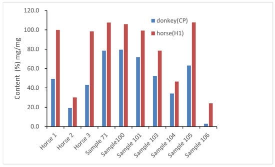Our method seems to be more powerful than the method proposed in the Chinese Pharmacopoeia. As shown in Table 6, there are controversial results for some samples containing horse-hide gelatin because markers in the Chinese Pharmacopoeia are donkey–horse shared markers, generating false-positive results when a sample contains horse-hide gelatin. Even when subtracting the corresponding content from horse-hide gelatin, the authentication results based on markers in the Chinese Pharmacopoeia are not ideal because the relative content of donkey markers in the Chinese Pharmacopoeia and horse-specific markers are different in different samples containing horse-hide gelatin (Figure 6). By contrast, our new markers directly indicate the presence of donkey-hide gelatin without the need for any other test or calculation.