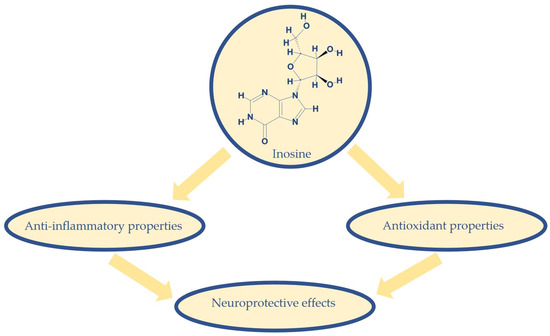 Indeed, the purine nucleoside inosine (IUPAC name: 9-[(2R,3R,4S,5R)-3,4-dihydroxy-5-(hydroxymethyl)oxolan-2-yl]-1H-purin-6-one; molecular formula: C10H12N4O5), which has different intracellular roles and serves as an extracellular modulatory signal, can exert neuroprotective effects that might depend on its antioxidant and anti-inflammatory properties (Figure 1) [2,3]. Nowadays, there is growing evidence that inosine can regulate inflammatory processes and neuronal growth properties that might be significant for neurodegenerative disorders [4].