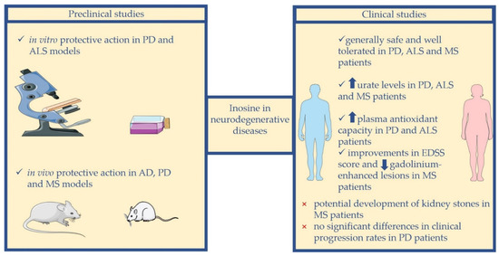 In this review, we discuss the possible use of inosine as a preventive or therapeutic strategy in the management of neurodegenerative diseases, and we report the current preclinical and clinical studies on this topic, focusing our attention on AD, PD, ALS, and MS (Figure 2).