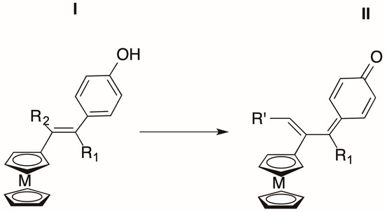 Access route via oxidation of ferrocene precursors to selectively electrophilic metallocene quinone methides. (I) Precursor of a metallocenic quinone methide inserted in a hydroxytamoxifen-like skeleton. (II) Example of organometallic and acyclic quinone methide obtained by oxidation of precursor (I) bearing a metallocenyl and a phenol group in trans configuration (with respect to the initial double bond). M = Fe; R1 = arene (preferentially -C6H5-p-OH); R2 = ethyl, (CH2)3X, with X = H, OH or succinimidyl; R’ = CH3, (CH2)2OH or (CH2)2-succinimidyl.
