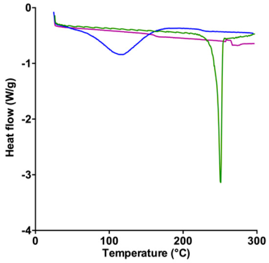 DSC curves for SuccFerr (green), SuccFerr:RAMEßCD (purple) and RAMEßCD (blue).