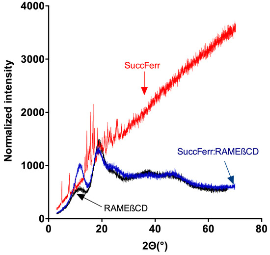 The XRD diffractogram (Figure 4) of pure SuccFerr exhibited numerous peaks, characteristic of its crystalline form. On the contrary, RAMEβCD showed only a broad amorphous band. The diffraction pattern of the freeze-dried complex showed that the drug had lost its crystalline state. This phenomenon is usually attributed to the complexation of the drug [25,26].