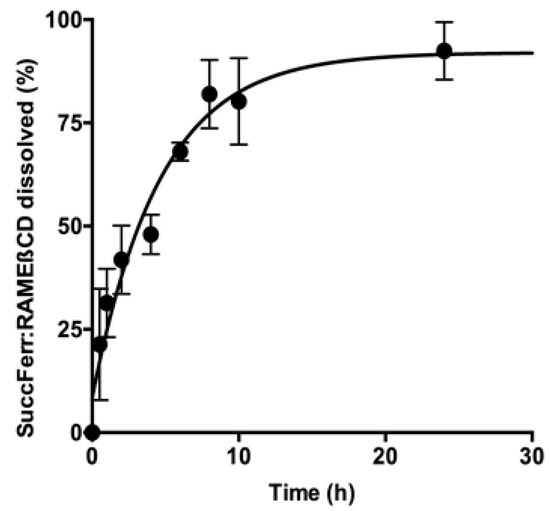Since the aim of this work was to prepare a soluble formulation of SuccFerr, the release profile is a key parameter. An immediate and complete dissolution of SuccFerr:RAMEßCD was observed in distilled water. Nevertheless, pure SuccFerr cannot be dissolved and was undetectable. A second experiment was carried out in a dialysis bag to consider the diffusion of RAMEßCD through the dialysis membrane. The profile of the curve displayed in Figure 5 shows that there is more than 80% in the external phase after 10 h.