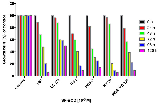 Inhibition of cell growth followed during 5 days by 10−5 M of complexed SuccFerr (SuccFerr:RAMEβCD) for various cancer cell lines (U87, LS174, Hela, MCF-7, HT29, MDA-MB231).
