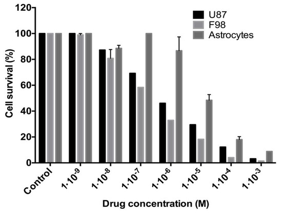 Cytotoxity of SuccFerr:RAMEβCD on U87 and F98 glioma cell lines and on astrocytes, as measured by cell survival percentage. Incubation: 72 h at 37 °C.