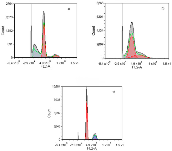 Flow cytometry analysis of DNA content for cell cycle analysis of U87. Cells were treated with: (a) 10−5 M of SuccFerr, (b) 10−5 M of complexed SuccFerr (SuccFerr:RAMEβCD), and (c) blank formulation (RAMEßCD). Modeling of the cell cycle was carried out using a mathematical tool (MultiCycleAV DNA, FCS Express 5 from De Novo software, Pasadena, CA, USA). DNA content was measured by propidium iodide staining.