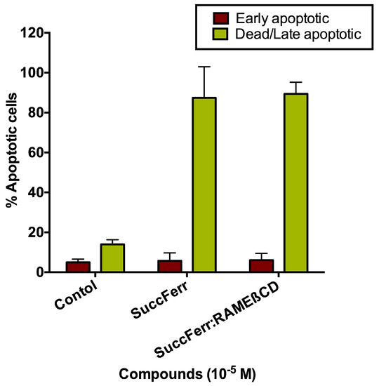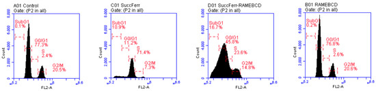 The number of cells in the sub-G1 phase increased from 0.1% (controls) to 16.7% when cells were treated with SuccFerr:RAMEβCD (Figure 9), suggesting an important apoptotic phenomenon that will be characterized and quantified specifically (Figure 10). When cells were treated with SuccFerr:RAMEβCD, the number of cells in the S increased from 2.4% (controls) to 23.6% (Figure 9).