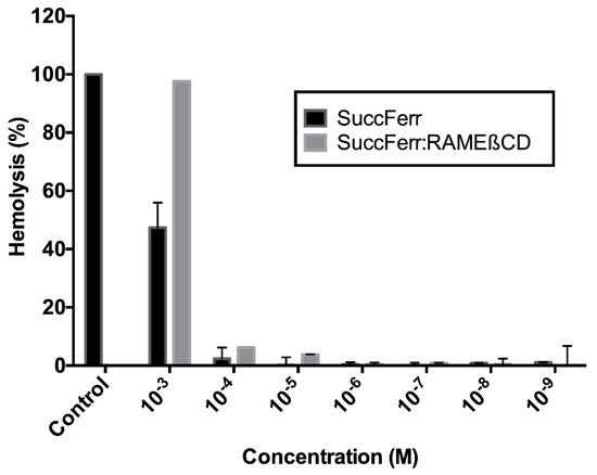 Methylated cyclodextrins are known to have hemolytic properties [27]. It was, therefore, necessary to compare the hemolytic properties of the free drug with the complex before envisioning any form of in vivo injection. In our experiment, SuccFerr:RAMEßCD was slightly more hemolytic than SuccFerr itself at 10−3 M (Figure 11). However, this hemolytic activity was greatly reduced at 10−4 M and at 10−5 M and absent at 10−6 M. These results indicate that there is a considerable concentration margin in terms of safety of intravenous administration, considering an IC50 value in the submicromolar range (1.6 × 10−7 M; CI 95% (1.0 × 10−7; 2.4 × 10−7).