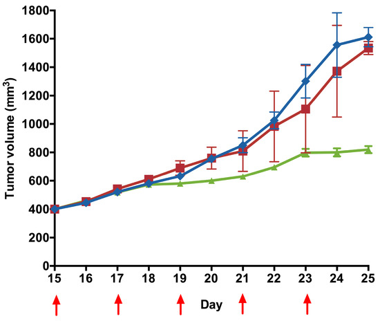 In vivo antitumor efficacy. Tumor volume after injection of 1 mg/kg of SuccFerr:RAMEßCD (-▲-), of the equivalent dose of RAMEßCD (-■-) and of NaCl (0.9%; 10 mL/kg; -♦-). n = 8. Mean tumor volumes ± SD. Treatment days are indicated by red arrows.
