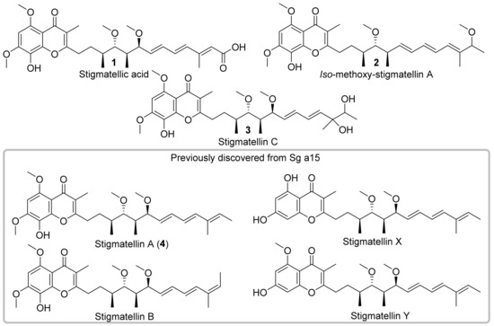 We report herein the full structure elucidation as well as cytotoxic and antimicrobial activities of three new stigmatellins, namely stigmatellic acid (1), iso-methoxy-stigmatellin A (2), and stigmatellin C (3, isolated as isomers) from the myxobacterium Vitiosangium cumulatum MCy10943T and provide further implications considering the unusual biosynthesis and side chain decoration of these aromatic polyketides (Figure 1).
