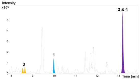 Cultivation of V. cumulatum MCy10943T was performed in CYHv3 medium with supplementation of adsorber resin XAD-16. The cell pellet and resin were submitted for further analysis of the associated secondary metabolome via liquid chromatography (LC) coupled with high-resolution mass spectrometry (HRMS), which revealed the uncharacterized secondary metabolites 1–3 alongside 4 (Figure 2). According to the observed tandem mass spectrometry (MS2) fragmentation pattern of the metabolites 1–4, the compounds 1–3 have been identified as new derivatives of the previously described stigmatellin congener 4. Hence, compound 4 was re-isolated from V. cumulatum MCy10943T crude extract and its structure was verified using NMR spectroscopy (Supplementary Materials 1 (Table S1)).