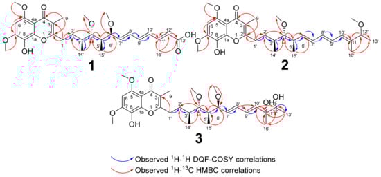 Key 1H-1H COSY and 1H-13C HMBC correlations for 1, 2 and 3.