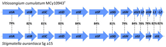 Comparison of the stigmatellin BGC from V. cumulatum MCy10943T and S. aurantiaca Sg a15. Percent in rectangles highlights identity score in BLAST comparison.