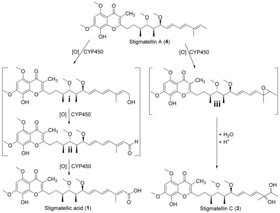 Nevertheless, we propose that 1 and 3 are formed from 4 by hydrogenation or epoxidation reactions presumably catalyzed by (different) CYP450s (Figure 5), whereas 2 seems rather to be a direct product from the PKS assembly line without further side chain decoration (Supplementary Materials 12 (Figure S36)). The proposed oxidation of the terminal methyl group of 4, which leads to a hydroxylation cascade affording 1 via the putative biosynthetic intermediates i and ii, has been previously described for other natural products. For example the ent-kaurenoic acid oxidase (CYP88A subfamily) catalyzes the formation of gibberellic acid GA12 in three steps, starting from ent-kaurenoic acid via the respective hydroxyl and aldehyde intermediate [28]. The formation of the diol side chain presented in 3 via an epoxide intermediate iii, parallels the commonly described mechanism for aromatic hydroxylation catalyzed by CYP450s [29]; after the initial epoxidation of the aromatic ring, the newly formed epoxide is opened and re-aromatized via hydride migration to yield a diol [30,31], such as proposed for the biosynthesis of prototenellin-C and proto desmethylbassianin C (proto DMB C) [32].