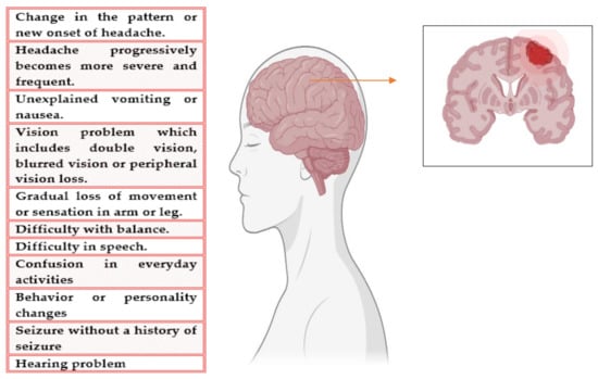 A brain tumor (BT) is an unconditional development of cells in the brain []. The symptoms of BT are difficult to diagnose, and the symptoms worsen during the progression of this disease. BT can originate in the brain (known as primary BT) or spread from other parts of the body (known as secondary or metastatic BT). The growth and location in the brain determine the response of cancer to nervous functioning []. The symptoms and mitigation options are also contingent on the size and location. The signs and symptoms of BT are shown in Figure 1. The condition or state in which a tumor cannot be detected in our body is called remission. Another problem that causes treatment failure is the recurrence of cancer after treatment []. The risk of reoccurrence can be in the original location or other parts of the body. If the tumor spreads, that is, when metastasis occurs, then the success rate of the treatment is reduced to 15% []. It is not always possible to recover from BT. If the tumor cannot be controlled or cured, then the disease may be called terminal or advanced. When diagnosed with advanced BT, the expected life span is calculated to be less than 6 months [].