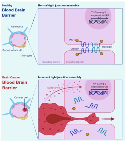 Cancer growth can reduce blood flow even in perineural regions by compressing blood vessels due to the limited space in the brain. Furthermore, the neurovascular unit develops differently in the cancer core compared to the cancer periphery and neuroparenchyma, the latter of which has an intact blood–brain barrier (BBB) as BT lesions grow []. In Figure 2, the difference between the healthy BBB and the BT BBB is shown.