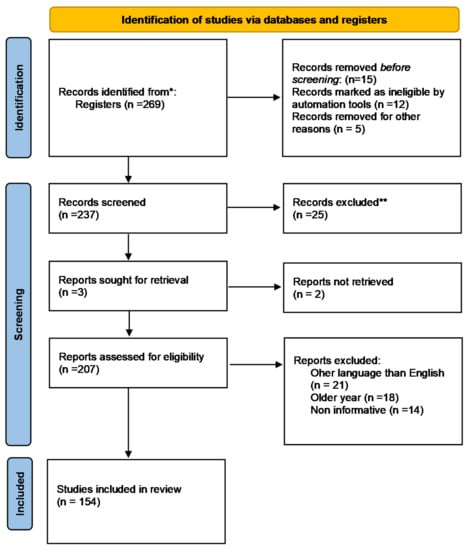 The authors conducted extensive research of the published literature on this topic, choosing scientific papers that address resveratrol implications in BTs, pathways of action, route of administration, cellular pathways, and apoptosis while emphasizing the most relevant and interesting aspects. The publishing intervals for the selected papers were infinite, and all publications produced this year were treated identically (until the submission date of the current study). To obtain precise and full information, the most well-known medical and biological databases (PubMed, Web of Science, Cochrane Library, Google scholar, and so on) were explored. To indicate the scope of the effort, in May 2022, a search on PubMed for the terms “resveratrol” and “cancer” yielded 4229 results, and resveratrol and BT generated 167 results. Figure 3 (a PRISMA flow chart) summarises the criteria used to choose the right bibliography and shows the entire process clearly using Page et al.’s recommendations []. The most crucial keywords (resveratrol, natural compound, BT prevention, molecular signals, cell signaling, combination therapy, apoptosis, and others) and the Medical Subject Heading (MeSH) phrases were used to search for the most relevant published data. The articles judged eligible were picked initially based on their title, keywords, and abstract; subsequently, the content analysis was decisive, aided by filtering tools (i.e., Clinical Queries). The source was utilized as a reference, and the most useful and relevant results and data were extracted.