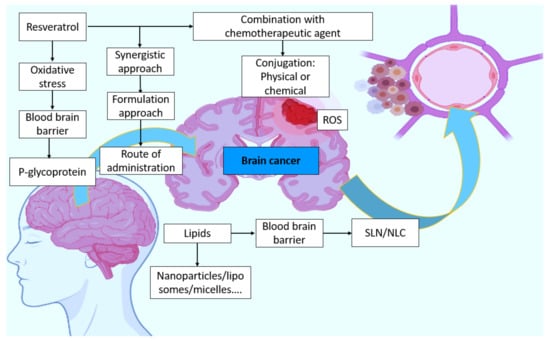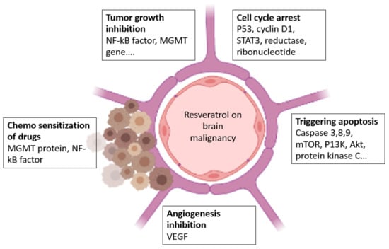 Hypothetical concept of resveratrol involvement in brain cancer and possible strategies.