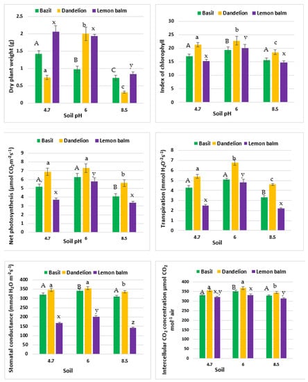Influence of soil pH on index of chlorophyll in leaves (Chl), the activity of net photosynthesis (PN), stomatal conductance (Gs), transpiration rate (E) and intercellular concentration of CO2 (Ci) augmented with heights of all investigated plants are in Figure 1. The largest plant heights of basil and dandelion were observed for original soil at pH = 6.0 Lemon balm behaved in and odd way, the highest plants were grown at pH = 4.7. The basic environment (pH = 8.7) substantially inhibited growth of all three plants (Figure S1). Alterations in the height of basil and dandelion plants were consistent with their photosynthesis indicators while lemon balm behaved in a different way. The largest Chl was observed at pH = 6.0 for all investigated plants while the highest net photosynthesis was found in the dandelion grown in soil at pH = 6.0. The intercellular CO2 concentrations did not differ substantially for all pH values. The alkaline reaction of the soil (pH = 8.7) reduced the net photosynthesis in lemon balm by 40% as compared to the control treatment (pH = 6.0) while the acidic conditions (pH = 4.7) prompted only 36% decrease. Dandelion and basil plants reacted in a less pronounced way. The most sensitive to alkaline environment was dandelion. It reduced photosynthesis intensity by closing stomata, which further reduced transpiration and CO2 capture by the plant. Those processes help to keep the intercellular CO2 concentration at a stable level and do not affect chlorophyll content substantially. Therefore, the plant photosynthesis apparatus remains ready for increasing its efficiency upon pH returning to neutral values.