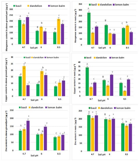 Manganese, copper and contents in above-ground parts and roots of basil, dandelion and lemon balm plants displayed against the pH modifications. Specific letters illustrate the statistically significant differences as computed with the Tukey’s HSD test (p = 0.95); roots and above-ground parts are treated independently.