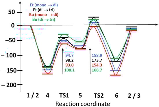 We analyzed the energetics of the direct esterification of phosphates (R = Et, Bu) with the corresponding alcohols (EtOH, BuOH) using DFT computations at the M062X/6–311+G (d,p) level of theory considering the solvent effect (SMD implicit solvent model) of the corresponding alcohol and 473 K as the temperature (Scheme 2, Table 2, Figure 1). Based on our previous model [17,19], we proposed a reaction complex containing three alcohol molecules and two phosphonic acid units, where one alcohol molecule acts as the reagent in the esterification. The other diester acid and ROH species in the reaction complex participated in the proton transfer chain supporting the establishment of the new P–O bond, and hence the formation of the diester acid, along with the departure of a water molecule.