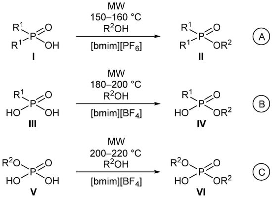 An interesting discipline is the synthesis of P-esters, such as phosphinates, phosphonates and phosphates. The traditional way is to start from P-chlorides (phosphinic chloride, phosphonic dichloride and phosphorus oxychloride), and to react them with alcohols or phenols in the presence of a base [14,15]. However, these transformations require cost-meaning P-chlorides, and are not atomic efficient. We were successful in developing an MW-assisted, [bmim][PF6]-promoted method for the direct esterification of a series of phosphinic acids (Scheme 1A) [16]. Phosphonic acids could also be converted to monoalkylphosphonates in a similar way using [bmim][BF4] (Scheme 1B) [17]. The series is complete if the monoalkylphosphate → dialkylphosphate transformation is also considered (Scheme 1C) [18]. The MW-assisted direct esterification of P-acids is an important method, as, in this way, the use of P-chlorides can be avoided. Hence, costs may be saved, and the formation of hydrochloric acid may be avoided.